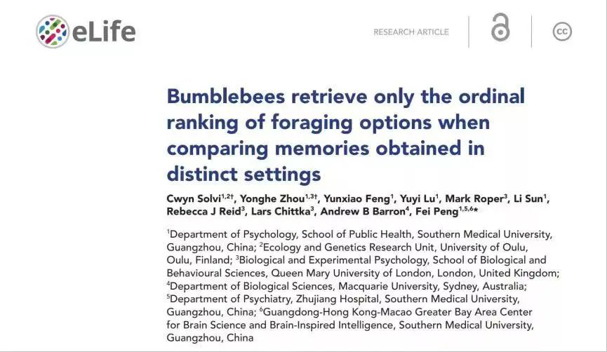 9月27日,南方医科大学彭飞教授课题组在国际著名生物学综合期刊《eLife》在线发表题为“Bumblebees retrieve only the ordinal ranking of foraging options when comparing memories obtained in distinct settings”的研究论文。