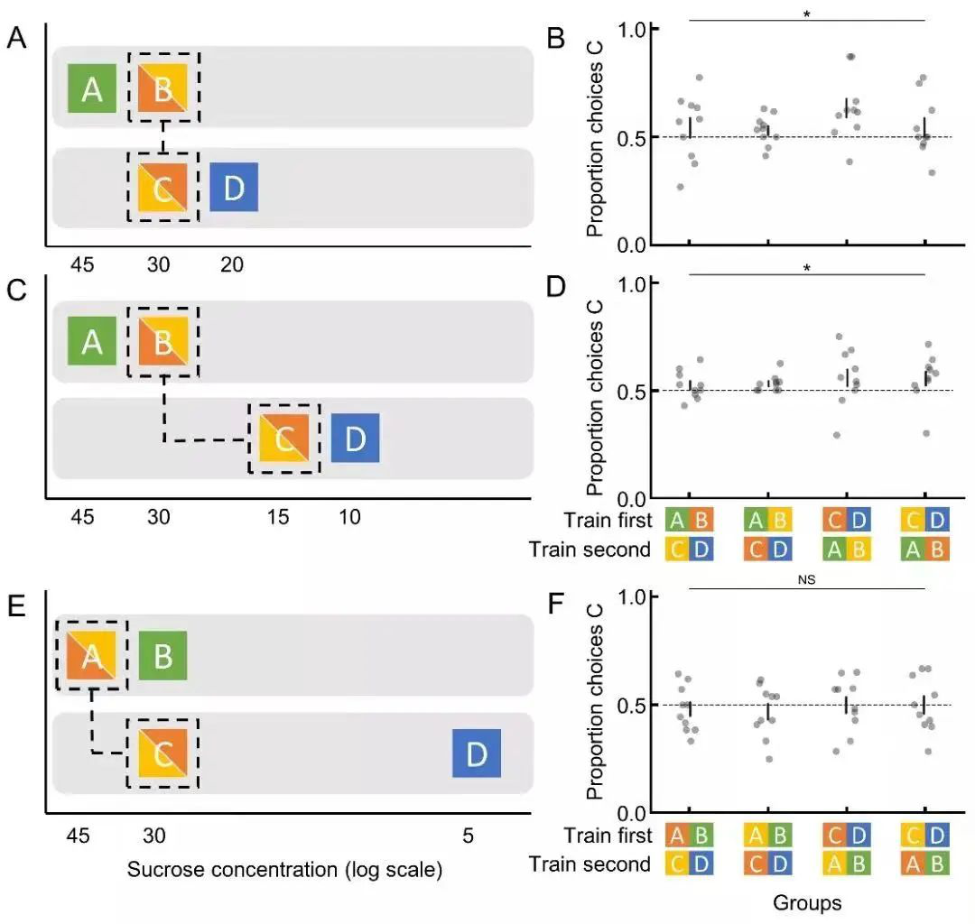 本研究进一步发现,熊蜂不能在短时记忆的时间范围(short-term memory;数分钟至数十分钟)之外使用对选项绝对信息的记忆(奖赏大小):训练熊蜂习得一种选项,1小时后再训练其学习另一种奖赏大小不同的选项,熊蜂并不能成功比较两种选项的奖赏大小。该研究揭示了熊蜂不同于人类和鸟类的价值决策机制,而这种差异可能来自于不同物种对环境特有的适应方式。