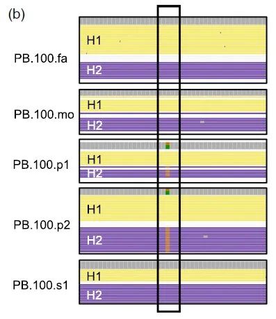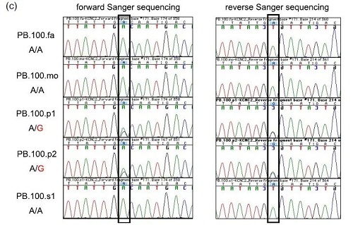 通过PacBio HiFi数据分析可将二倍体样本进行单体型(H1,haplotype 1和H2,haplotype 2)组装。KCNC2突变仅能在自闭症患者(PB.100.p1, PB.100.p2)中发现。作者使用Sanger数据进行确认,验证了这一发现。