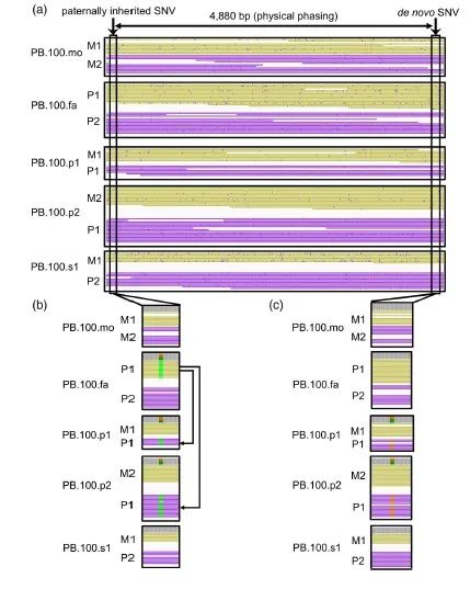 使用DeepVariant分析软件对PacBio HiFi数据进行进一步分析,在4880bp区域中根据鉴定出的SNV进行定相分析,发现了KCNC2 de novo突变。该突变与在两个自闭症患者中发现的突变位于同一条染色体上,结合家族成员的测序结果来看,可判断该突变遗传自父本。
