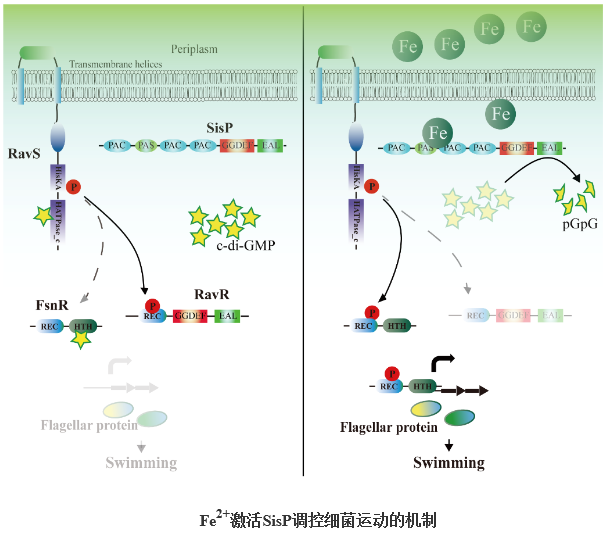 嗜麦芽宅食单胞菌(Stenotrophomonas maltophilia)是近年来严重威胁人民生命健康的医源性条件致病细菌,ICU病房检出率高,致死率高,多重耐药。前期研究表明环二鸟苷单磷酸(c-di-GMP)是该细菌调控毒力和细胞感染行为的重要第二信使分子,但精细调控机制不明。本研究在系统突变嗜麦芽宅食单胞菌全部33个c-di-GMP代谢酶编码基因的基础上,发现磷酸二酯酶SisP是细菌感知亚铁离子并控制鞭毛合成的关键调控蛋白。当细菌生存于寄主因急性损伤或出血导致的富铁环境时,亚铁离子结合SisP,提高了SisP降解c-di-GMP的酶活性。该过程解除了c-di-GMP对细菌鞭毛合成调控蛋白FsnR的抑制作用。同时,SisP介导的c-di-GMP降解也提高了FsnR的磷酸化水平。这两个过程共同作用,增强了FsnR上调细菌鞭毛合成的活性,最终增强了细菌的游动性和感染能力。