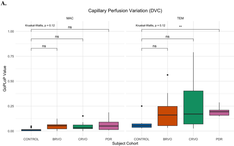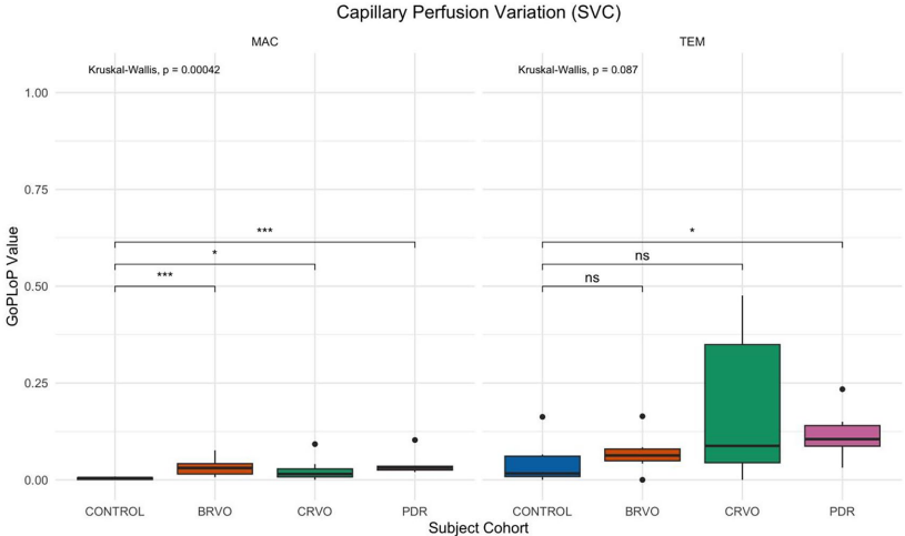 本研究利用光学相干断层扫描血管成像(OCTA)技术,针对视网膜静脉阻塞(BRVO/CRVO)和增殖性糖尿病视网膜病变(PDR)患者,通过量化30分钟内毛细血管灌注增益(GoP)与灌注丢失(LoP)之和(GoPLoP),首次揭示病理状态下视网膜间歇性灌注变异显著高于健康对照组,深层血管丛(DVC)变异尤为明显,该指标或成为评估视网膜缺血的新型生物标志物。