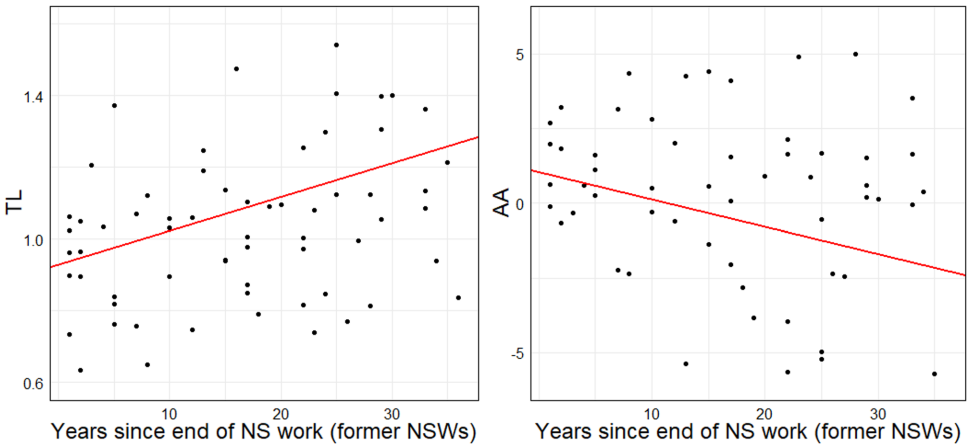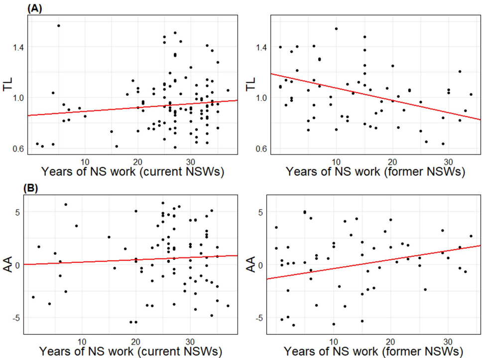 为探究夜班工作(NS)对老年工作者生物衰老的影响,研究人员开展横断面研究,通过定量PCR检测端粒长度(TL)和五基因CpG位点甲基化分析表观遗传年龄(DNAm age)。发现当前夜班工作者TL显著缩短(β=-0.07,p=0.03),累积暴露量与TL负相关(β=-0.01,p=0.004),且停止夜班后TL逐年恢复(β=0.01,p=0.001)。表明夜班工作加速细胞衰老,但具有可逆性,为 occupational stress 管理提供生物标志物依据。