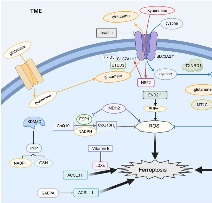 本综述系统阐述了肾透明细胞癌(ccRCC)中脂质代谢重编程与铁死亡抵抗间的精密互作网络。文章揭示了ccRCC通过上调CD36、SCARB1等脂质摄取蛋白和ACLY、FASN等合成酶系驱动脂质堆积,同时通过xCT-GSH-GPX4轴和FSP1-CoQ10H2系统构建抗氧化防御屏障。作者创新性提出靶向脂质代谢(如ACC、SCD1抑制剂)与诱导铁死亡(如GPX4抑制剂RSL3)的协同治疗策略,为克服ccRCC耐药性提供了代谢干预新范式。