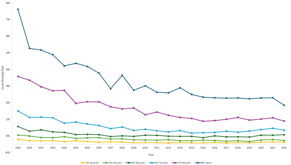 本研究基于CDC WONDER数据库分析了1999-2022年美国35-85岁成人结核病(TB)死亡率趋势。研究人员通过Joinpoint回归模型发现总体年龄调整死亡率(AAMR)显著下降(AAPC=-3.95%),但不同性别、种族、年龄和地域存在显著差异。亚洲/太平洋岛民、非裔和拉丁裔人群的AAMR持续高于白人,农村地区死亡率高于城市。该研究为制定针对性TB防控策略提供了关键流行病学依据。