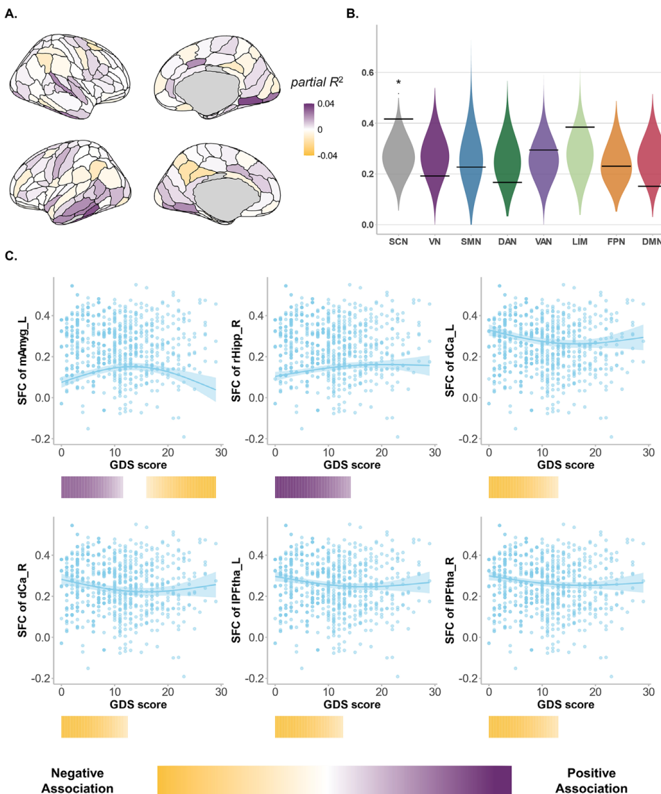 本研究针对老年抑郁症状的神经机制,利用多模态神经影像技术(dMRI/rs-fMRI)首次系统揭示了结构-功能连接耦合(SFC)在腹侧注意网络(VAN)和皮层下网络(SCN)的异常增强现象。通过对830名老年人群的分析,发现代谢性疾病(如高脂血症、糖尿病)和睡眠障碍患者存在特异性SFC改变模式,且左杏仁核SFC与症状严重度呈倒U型关联。该研究为老年抑郁的精准干预提供了新型神经标记物,对推动个体化临床管理具有重要意义。