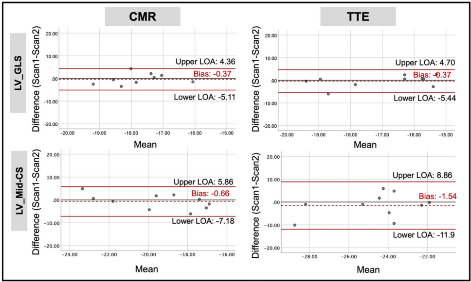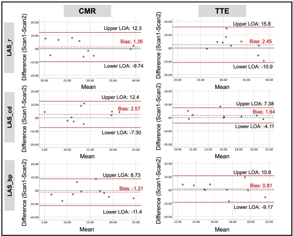 本研究针对心肌形变评估中不同影像学技术间一致性与可重复性数据缺乏的问题,由Aseel Alfuhied团队系统比较了经胸超声心动图(TTE)与心血管磁共振(CMR)对左心房应变(LAS)和左心室应变/应变率(LV S/SR)的测量差异。结果显示两种技术对LAS具有中等一致性(ICC=0.55-0.69),但对LV参数一致性较差(除PLDSR外ICC均<0.5),表明TTE与CMR不可互换使用。在10例2型糖尿病(T2D)患者的重复性测试中,CMR对LAS和LV应变率的重复性总体优于TTE。该研究为临床选择心肌形变评估方法提供了重要依据。