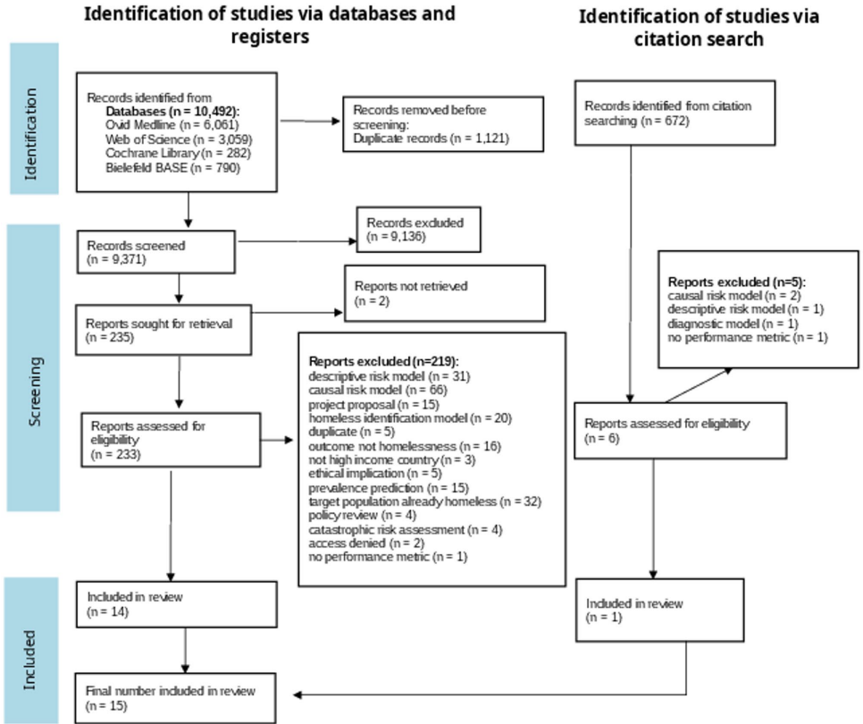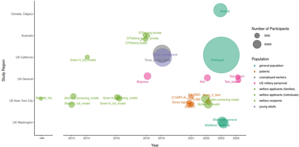 本范围综述系统梳理了高收入国家中预测未来无家可归风险的模型,揭示了该领域研究的高度异质性。分析涵盖的15项研究(主要来自美国)显示,模型多采用逻辑回归(Logistic Regression)或考克斯回归(Cox Regression),仅少数结合机器学习(Machine Learning, ML)算法。研究强调,尽管这些模型在精准定位高风险人群、提升预防项目效率方面潜力巨大,但存在外部验证严重不足(仅2个模型)、校准指标使用有限等关键局限。作者呼吁未来研究应聚焦于模型评估、伦理考量及数据保护,以推动其向现实世界的有效转化。