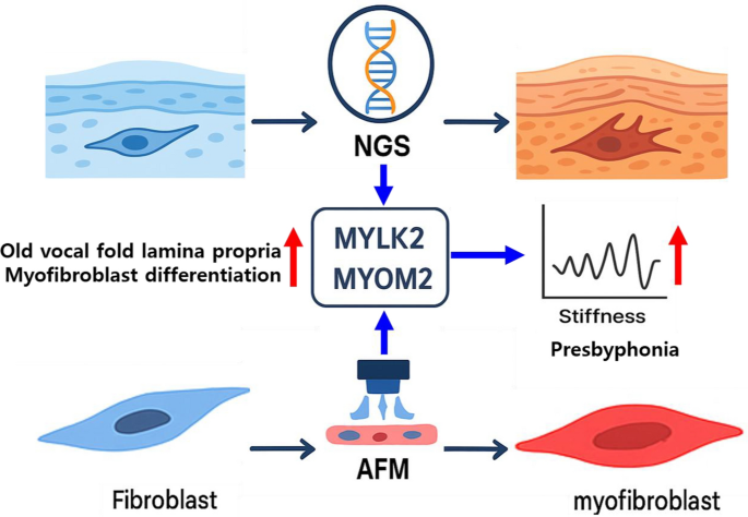 衰老声带黏膜下层肌原纤维基因表达变化及功能研究显示,Mylk2和Myom2显著上调,与细胞衰老及肌成纤维细胞分化相关,抑制其可降低细胞收缩和声带硬度。