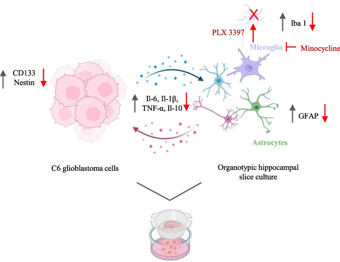 胶质母细胞瘤微环境中的小胶质细胞激活通过分泌TNF-α、IL-1β、IL-6和IL-10促进肿瘤细胞去分化(CD133/Nestin升高),米诺环素和PLX3397抑制小胶质细胞可逆转该过程并缩小实体瘤体积。