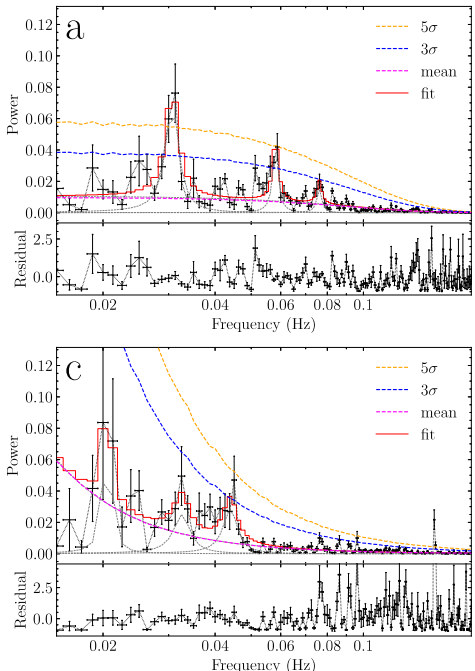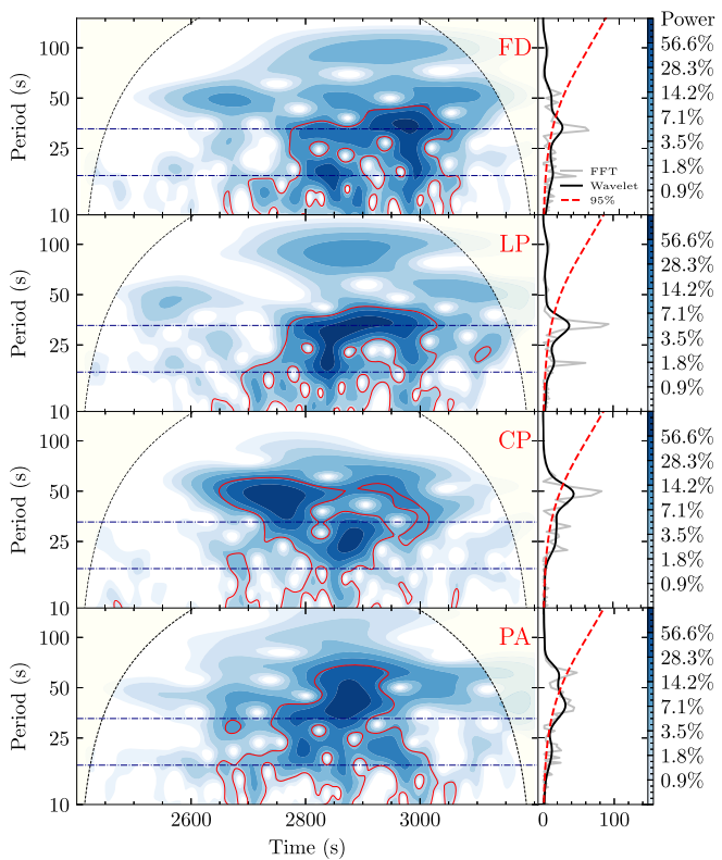 在射电流量上升阶段(观测时间2700-3100秒),FAST首次捕捉到线性偏振度(LP)与流量密度(FD)的显著反相关振荡(Pearson系数-0.79)。功率谱分析显示两者均存在17秒和33秒的显著周期信号(置信度>5σ),而圆偏振(CP)和位置角(PA)仅呈现微弱周期特征(图3)。