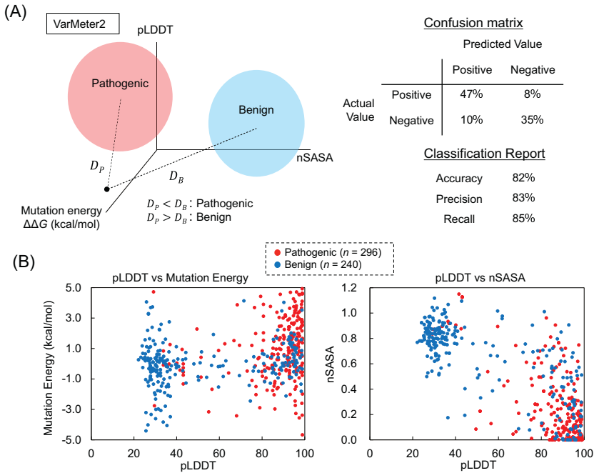 升级版VarMeter2新增pLDDT评分(反映局部结构置信度)和Mahalanobis距离分析,通过三维参数空间聚类(图4)将准确率提升至82%。例如对Sanfilippo综合征相关SGSH基因的Q365P变异,其预测的致病性(△△G=7.2 kcal/mol,nSASA=0.03)与实验验证的酶活丧失完全吻合。