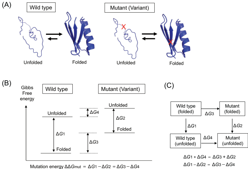 蛋白质稳定性可通过吉布斯自由能(△G)量化,错义变异通过改变△△G(△G突变体-△G野生型)破坏折叠平衡。如图1所示,△△G>0表示变异 destabilizes 蛋白结构。FoldX等工具能计算△△G,但误差达±0.85 kcal/mol,且受实验条件异质性限制。