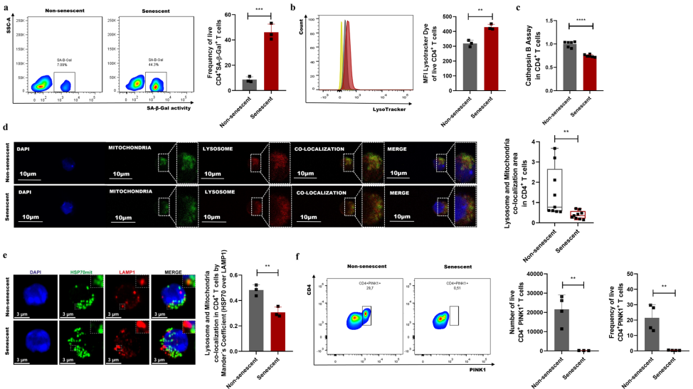 研究采用C57BL/6小鼠脾脏分离CD4+T细胞,通过400μM H2O2诱导应激性早衰。利用流式细胞术检测SA-β-Gal活性、线粒体膜电位(TMRE)和ROS(MitoSOX);共聚焦显微镜分析线粒体-溶酶体共定位;Western Blot检测磷酸化p38;ELISA-Multiplex定量Th17相关细胞因子;并采用特异性抑制剂BIRB-796进行功能挽救实验。
