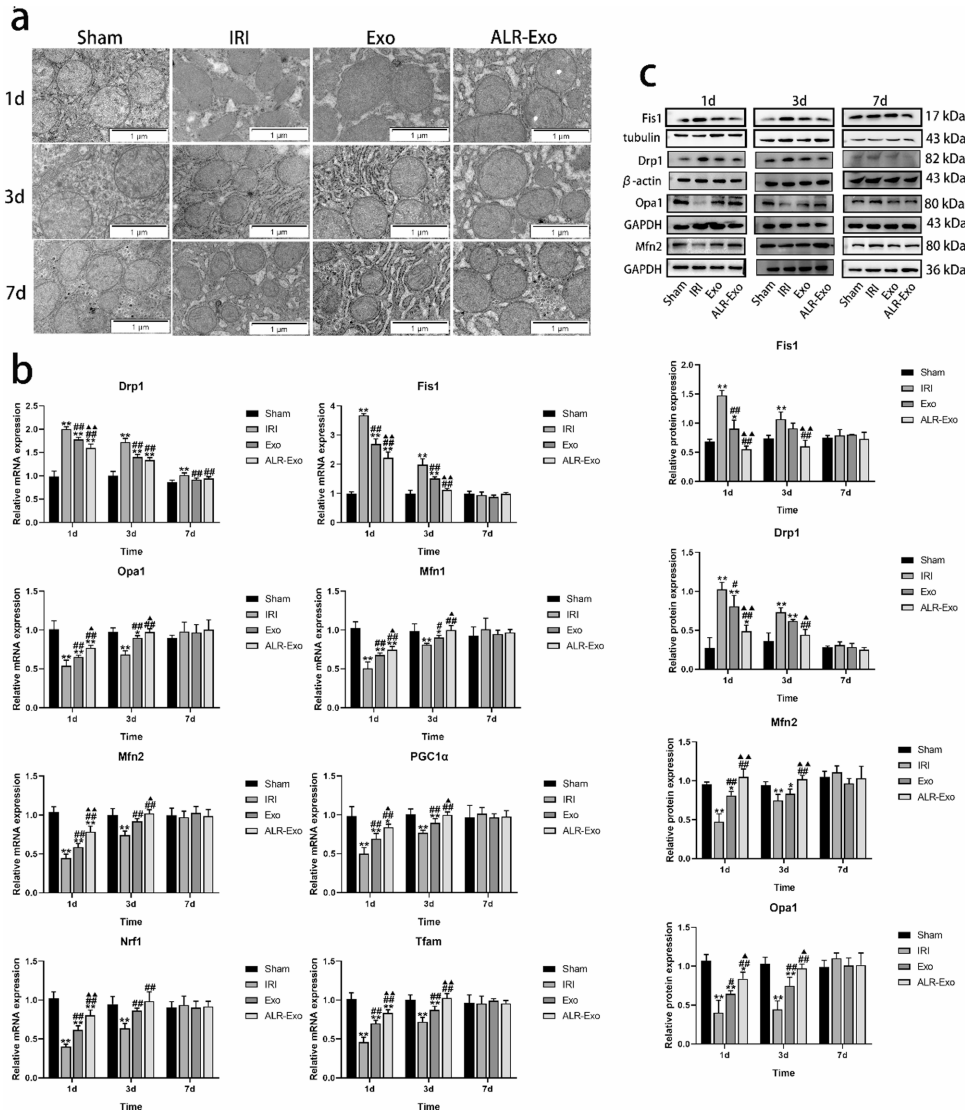 电镜观察到ALR-Exo维持线粒体嵴结构完整,使ATP产量提升68%(p<0.01)。机制上通过抑制分裂蛋白Drp1/Fis1(下调40%),促进融合蛋白OPA1/Mfn2(上调3倍)及生物合成关键因子PGC1α/Tfam的表达,并减少LC3B与线粒体的共定位(mitophagy降低55%)。
