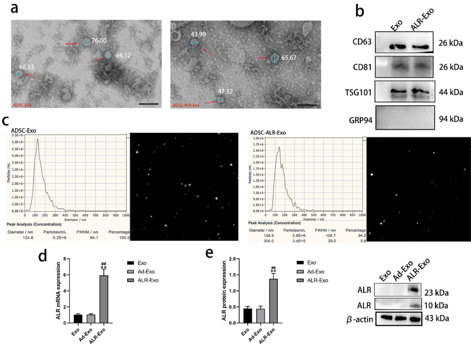 通过透射电镜观察到ADSC-ALR-Exo保持典型杯状双膜结构(直径30-150nm),Western blot检测到CD63/CD81/TSG101阳性标记,且ALR蛋白表达量较普通外泌体显著提升(p<0.01)。
