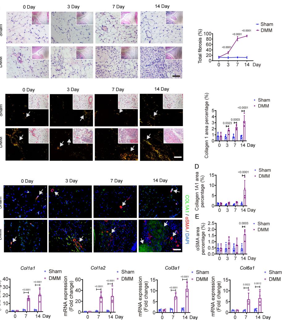 DMM术后3天即观察到IPFP纤维化改变,14天时胶原I沉积显著增加。免疫荧光显示αSMA阳性肌成纤维细胞和血管样结构明显增多,伴随Col1a1、Col3a1等纤维化标志物表达上调。