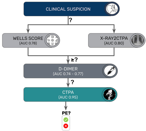 在急诊科,胸部X光(CXR)因其快速、经济的特点成为心肺疾病筛查的首选,但其二维特性与低软组织对比度严重限制了肺栓塞(PE)的诊断能力。而作为金标准的CT肺动脉造影(CTPA)虽能提供三维血管细节,却存在辐射暴露、造影剂风险和医疗成本高等问题。据统计,仅5-15%的CTPA检查最终确诊PE,造成大量医疗资源浪费。这一临床困境催生了对新型诊断技术的迫切需求。