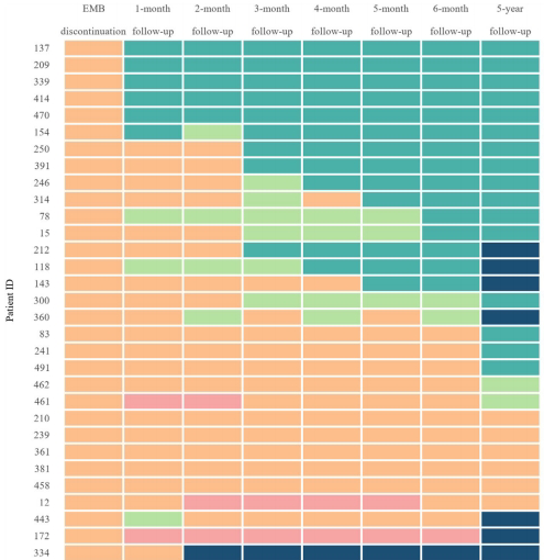 研究纳入2016-2025年台中荣民总医院476例EMB治疗患者,建立多学科协作的程序化监测体系:1) 通过电子病历系统强制弹窗收集主观视觉症状;2) 直接观察治疗(DOT)提供者每周进行客观视力及色觉检测;3) 异常者转诊眼科完成30-2 Humphrey视野检查、光学相干断层扫描等确诊;4) 对确诊EON患者进行6个月临床随访和5年电话随访,评估视力恢复情况(完全恢复定义为恢复基线水平,部分恢复需视力或色觉改善≥2级)。