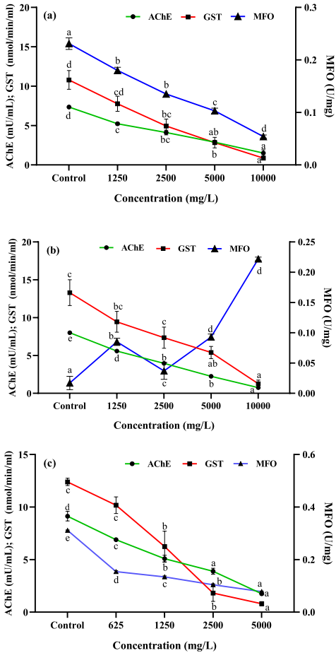 酶活性测定结果表明,种子母体提取物(SPE)和茎母体提取物(STPE)的所有浓度均显著抑制豆蚜体内的AChE和GST活性。较高浓度的SPE(10,000 mg/L)对AChE(17.36 mU/mg)和GST(6.34 nmol/min/mL)的抑制最强,但诱导了MFO活性(0.21 U/mg)。同样,高浓度STPE(10,000 mg/L)显著降低了AChE(1.66 mU/mg)和GST(1.06 nmol/min/mL)活性,但也诱导了MFO。
