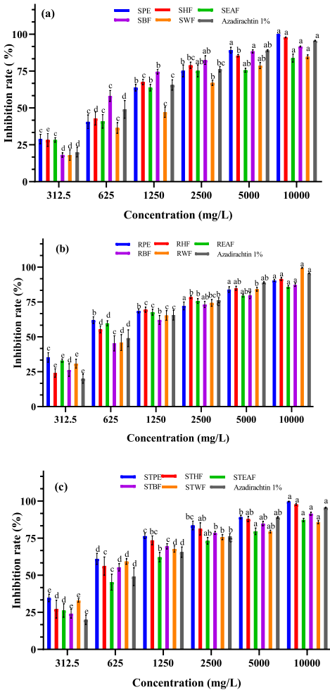 所有测试样品均表现出浓度依赖的杀虫活性,较高浓度下活性更强。种子母体提取物(SPE)、茎母体提取物(STPE)和化合物3的杀虫作用机制是通过抑制试虫体内的乙酰胆碱酯酶(AChE)、谷胱甘肽-S-转移酶(GST)和混合功能氧化酶(MFO)实现的。