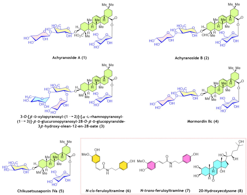 从种子中分离得到8个化合物,包括achyranoside A(1)、achyranoside B(2)、3-O-[β-D-xylopyranosyl-(1→2)]-[α-L-rhamnopyranosyl-(1→3)]-β-D-glucuronopyranosyl-28-O-β-D-glucopyranoside-3β-hydroxy-olean-12-en-28-oate(3)、momordin IIc(4)、chikusetsusaponin IVa(5)、N-cis-feruloyltyramine(6)、N-trans-feruloyltyramine(7)和20-hydroxyeckdysone(8)。这些化合物的结构通过NMR和HR-ESI-MS等技术进行了详细表征。