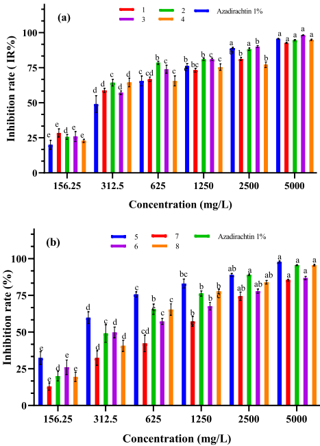 在咖啡粉蚜中,高浓度SPE(10,000 mg/L)对AChE(1.51 mU/mg)、GST(0.86 nmol/min/mL)和MFO(0.054 U/mg)的抑制最强。STPE和化合物3在两种较高浓度下对所有酶的抑制率均超过50%。