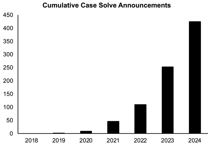法医遗传谱系技术通过结合SNP分型与 genealogical数据库,已成为推动MPS技术在法医学中应用的核心动力。Othram公司的案例统计显示,采用FGG技术解决的案件数量呈现持续增长趋势,这一技术不仅适用于暴力犯罪侦查,更为无名遗骸的身份鉴定提供了全新途径。