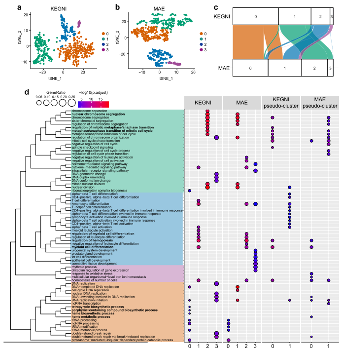 以小鼠造血干细胞红系谱系(mHSC-E)数据集为例,对KEGNI和MAE生成的基因嵌入进行聚类和GO富集分析。结果显示,KEGNI聚类结果更符合生物学背景,调整兰德指数(ARI)为0.575(MAE为0.407)。簇KEGNI_0显著富集“四吡咯生物合成过程”等术语,KEGNI_1富集“髓系细胞分化调控”等术语,与红细胞发育的关键过程一致,而随机伪聚类则无此特征,表明KEGNI捕获了具有生物学意义的模式。