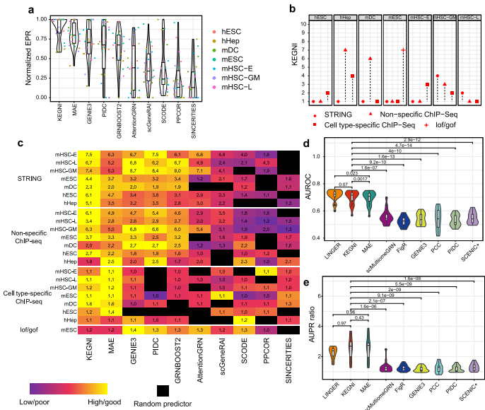 研究使用BEELINE框架评估KEGNI性能,涵盖5个小鼠和2个人类细胞系的7个scRNA-seq数据集,以早期精确率(EPR)为主要指标。结果显示,KEGNI在12项基准测试中表现最佳,其归一化EPR值显著高于PIDC、GENIE3、GRNBoost2等8种方法。独立运行的MAE模型也优于多数现有方法,表明自监督学习策略有效捕获了基因关系。此外,在利用配对scRNA-seq和scATAC-seq数据的PBMC数据集上,KEGNI与LINGER性能相当(AUROC分别为0.699和0.714),显著优于仅使用scRNA-seq的方法。