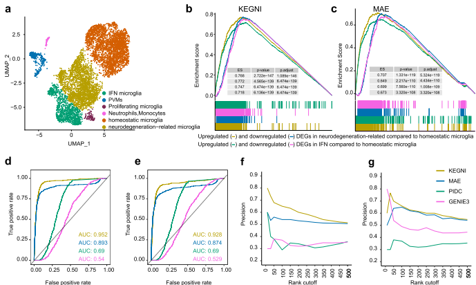 利用Cop1敲除微胶质细胞的scRNA-seq和ChIP-seq数据,以差异表达基因(DEG)和ChIP-seq靶基因为金标准,评估KEGNI对Cop1和Cebpb调控基因的预测能力。基因集富集分析(GSEA)显示,KEGNI的富集分数(ES)显著高于其他方法(调整p<0.05),AUROC达0.952和0.928。以ChIP-seq验证时,KEGNI在top-k精确率曲线中表现最佳,证实其能高置信度预测直接靶点。