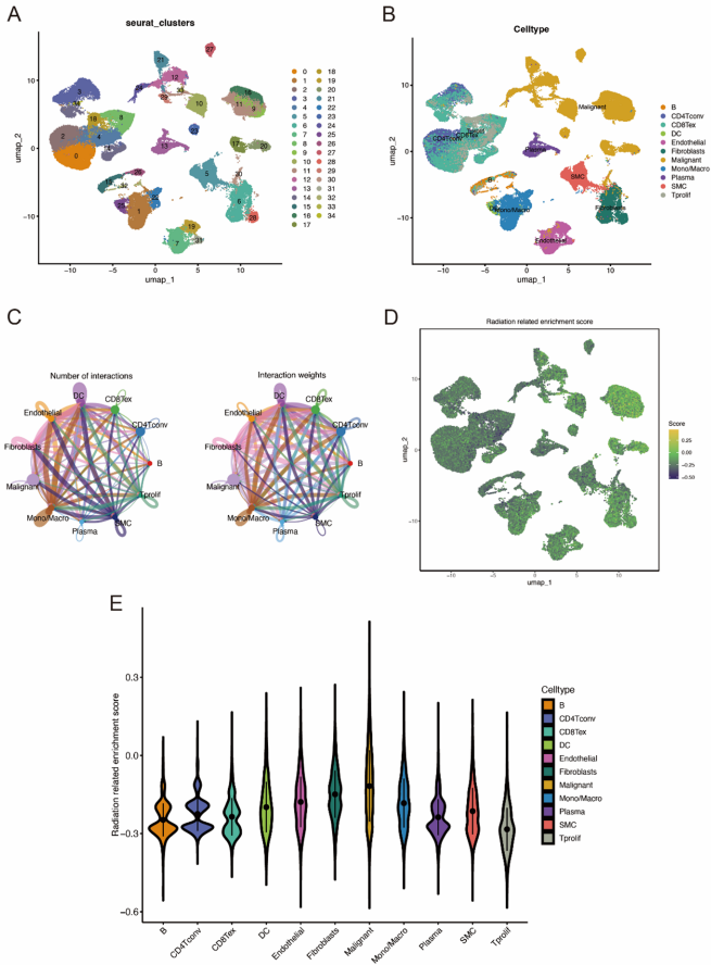 分析85,692个单细胞数据发现,辐射相关基因活性主要在恶性细胞和成纤维细胞中富集,这解释了为什么放疗反应与肿瘤细胞特性密切相关。