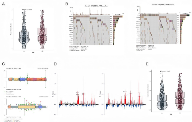 高风险组具有更高的肿瘤突变负荷(TMB)和基因组改变比例(FGA)。TP53突变在高风险组更常见(44% vs 24%),而PIK3CA突变在低风险组更频繁(38% vs 27%)。拷贝数变异模式在风险组间也存在显著差异。