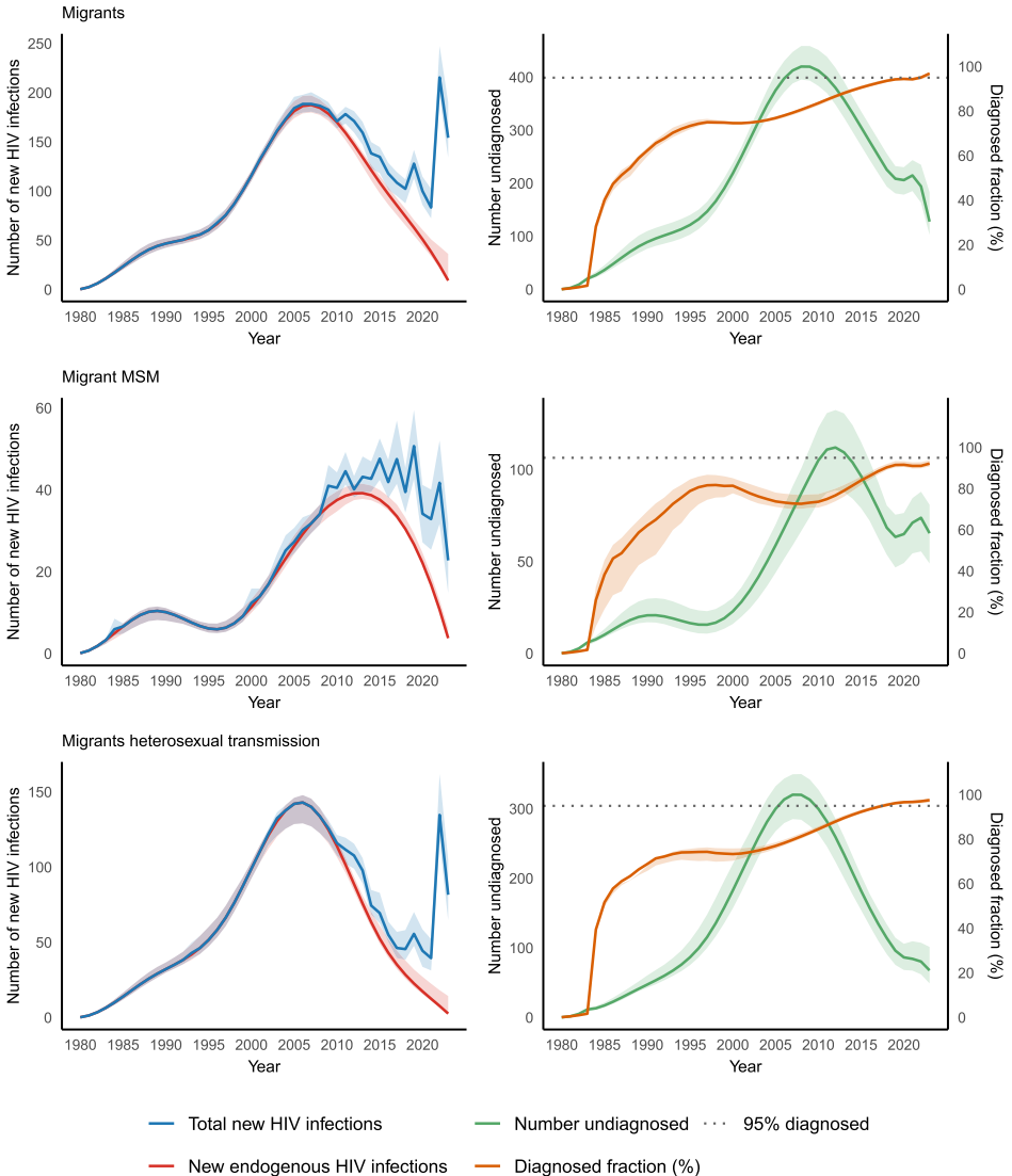 为准确评估HIV流行趋势及未诊断人群规模,研究人员利用挪威国家登记数据与ECDC HIV建模工具开展回溯计算研究。结果显示挪威HIV新发感染率显著降低,总体诊断率达96.5%(95% CI:95.1%-96.9%),已实现WHO提出的95%诊断目标。该研究为移民感染区分及疫情监测提供了重要方法论框架。