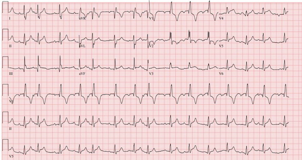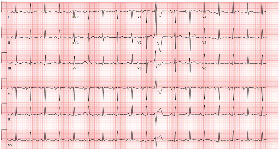 入院时心电图(ECG A)仅显示窦性心动过速和单次室性早搏(Premature Ventricular Contraction, PVC),无明显传导异常。然而随着病情进展,第三天出现新的电传导障碍,心电图(ECG B)显示新发的一度房室传导阻滞和右束支传导阻滞。
