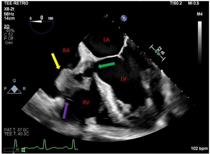 紧急TEE检查证实了室间隔完全侵蚀和生物主动脉瓣膜开裂,二维图像清晰显示右心房内大型赘生物和相关的Gerbode缺损。多普勒超声进一步显示主动脉根部感染沿瓣周扩展,室间隔膜部侵蚀入右心房,左心室流出道与右心房之间存在连续性左向右分流,并伴有重度主动脉反流。