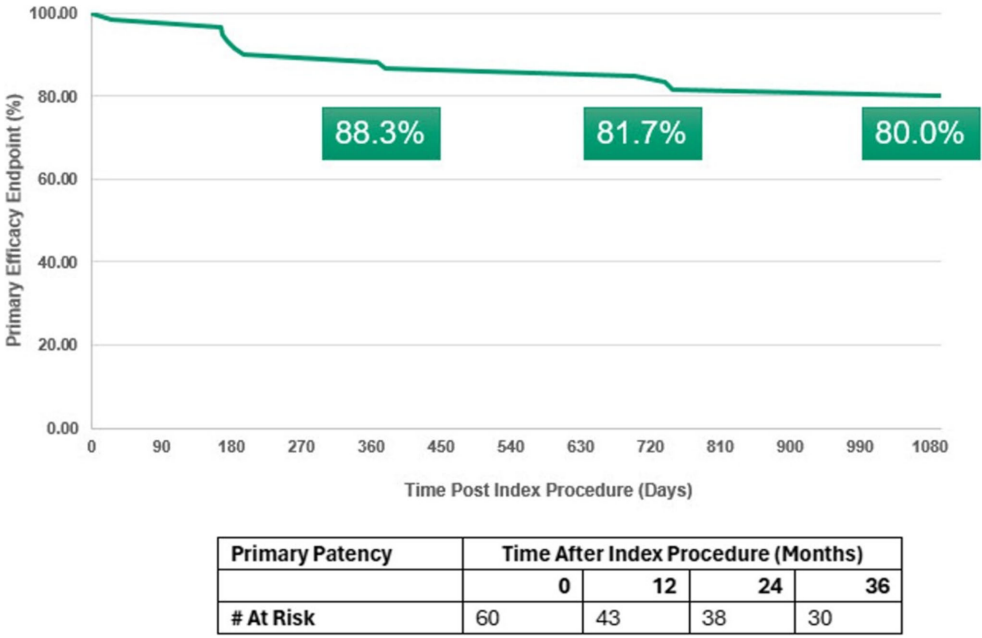通过核心实验室裁定的CFDU检测发现,12、24和36个月时的一期通畅率分别为88.3%、81.7%和80%。尽管随访肢体数量随时间减少(12个月时43肢,36个月时30肢),但通畅率保持稳定,表明支架在长期内有效维持了血管开放。
