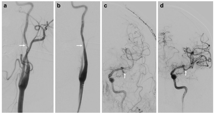 本研究主要采用以下技术方法:计算机断层扫描血管成像(CTA)用于评估血管解剖和支架完整性,CT灌注成像(CT Perfusion)分析脑血流动力学状态,数字减影血管造影(DSA)确认血管病变并指导介入操作,磁共振成像(MRI)监测脑组织继发性损伤。此外,经口茎突切除术(Transoral Styloidectomy)通过内镜辅助下经咽旁入路完成,而二次支架植入选择闭孔设计支架(CGuard)以降低再狭窄风险。所有影像评估均包含急性期与随访期对比分析。