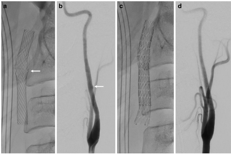 正常茎突长度小于2.5cm,人群中3cm以上延长发生率约4-10%,但仅4%出现症状。Pagano等系统综述收录37例鹰综合征相关ICA夹层病例,其中仅1例为偶然发现,其余均表现为急性卒中。本研究汇总的6例支架断裂病例(含本例)显示,断裂发生时间介于术后2周至1年,且50%病例初始无症状。值得注意的是,Carotid Wallstent、Xact、CASPER及FRED等多种支架类型均曾发生断裂,提示压迫性力学损伤可能超越器械设计差异。