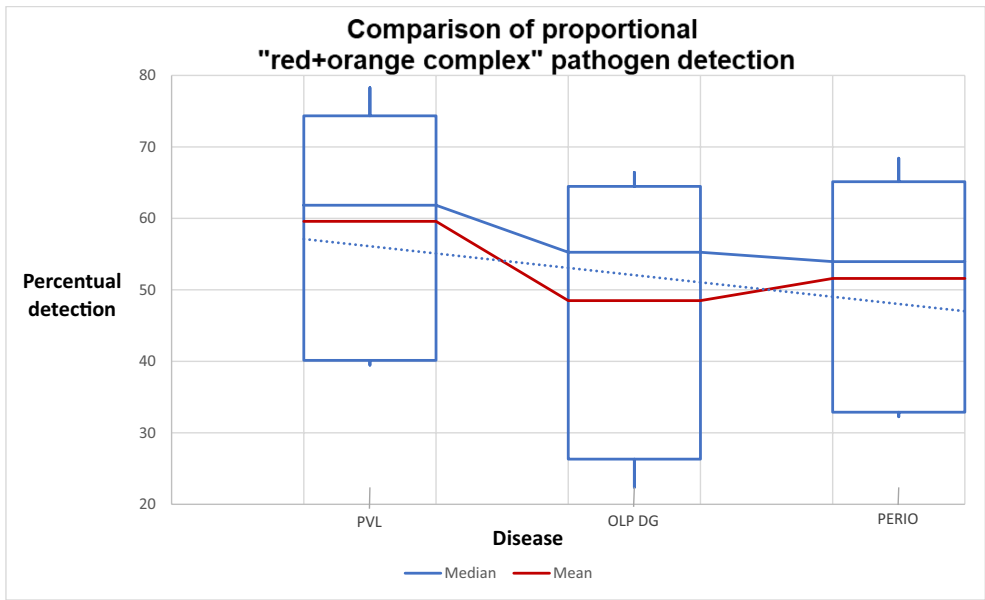 比较了12种检测细菌的比例值及其计数。计算了体积的平均值和中位数。表3展示了红色和橙色复合体病原体的百分比比例比较(最高值以粗体显示)。