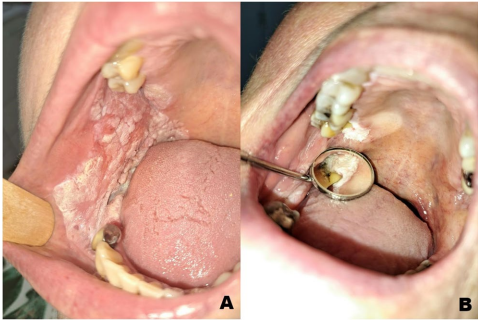 PVL被世界卫生组织(WHO)列为口腔潜在恶性疾患(Oral Potentially Malignant Disorders, OPMDs)之一,并且是所有OPMD中恶变比例最高的,其次是红斑病。PVL最常见的恶变部位是牙龈和腭部。