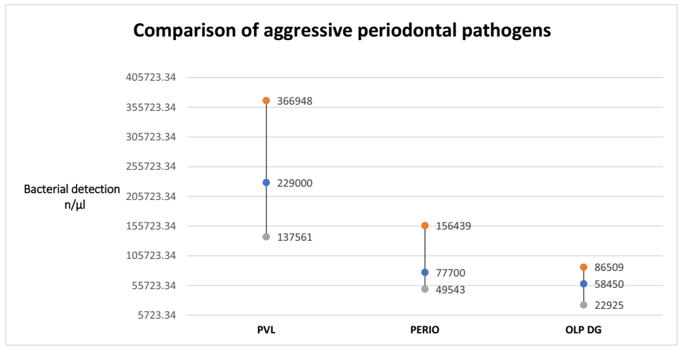 PVL病例在红色和橙色复合体中每种病原体的比例比率、平均和中位数计数以及牙周吸收的风险比率方面均显示出对其他两组的优势。这种差异具有统计学显著性,比例检测的p=0.0009(Kruskal-Wallis检验),置信区间如下:PVL(3-3),牙周炎(2-3),和OLP(2-2)。对于细菌体积(以微升计),统计显著性为p=0.0003(Kruskal-Wallis),置信区间为:PVL(CI:138k-367k),牙周炎(CI:50k-156k),和OLP w/DG(CI:23k-87k)。两次比较的结果如图3和图4所示。