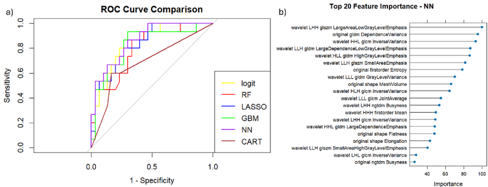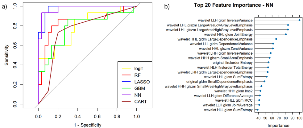 为开展本研究,研究人员采用回顾性设计,纳入了100例乳腺癌患者的MRI数据,共155个淋巴结区域(52个转移性,103个非转移性)。影像数据来源于1.5T MRI扫描仪,序列包括T2加权(STIR TSE)和动脉期(对比剂注射后120秒)T1加权DCE-MRI。两位经验丰富的放射科医师使用3D Slicer平台进行手动病灶分割,并提取了851个符合影像生物标志物标准化倡议(IBSI)的影像组学特征,涵盖一阶统计、形状特征(2D和3D)及纹理特征(如GLCM、GLRLM、GLSZM、GLDM、NGTDM)。特征经z-score标准化后,通过弹性网络(Elastic Net)正则化逻辑回归进行特征选择,保留重现性高(ICC>0.75)的稳健特征。机器学习模型包括逻辑回归(Logit)、随机森林(RF)、LASSO、梯度提升(GBM)、神经网络(NN)和分类回归树(CART),数据集按7:3划分为训练集与测试集,采用十倍交叉验证优化模型性能。诊断效能通过曲线下面积(AUC)、敏感性、特异性等指标评估,统计分析和模型比较使用R语言完成。