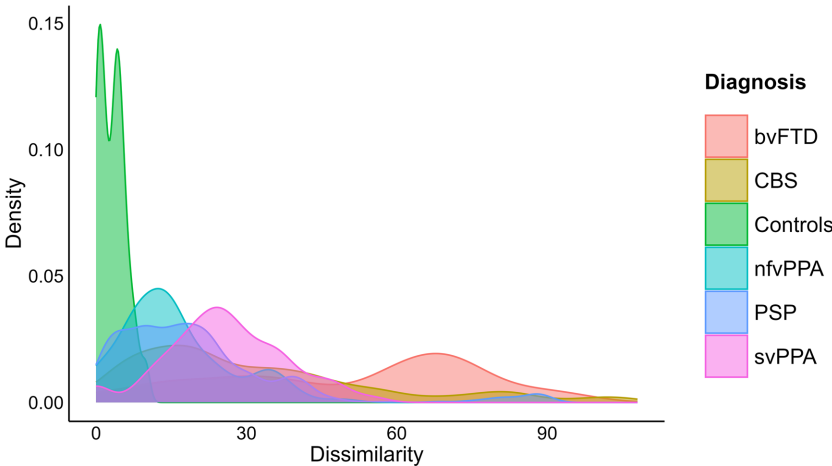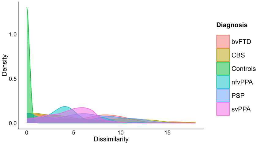 bvFTD在皮质厚度方面表现出最高的组内异质性(中位数汉明距离=36.5),显著高于其他所有组(p<0.01)。svPPA、CBS和PSP的异质性也高于对照组,但低于bvFTD。皮下体积异质性则以PSP最高,其次为svPPA。