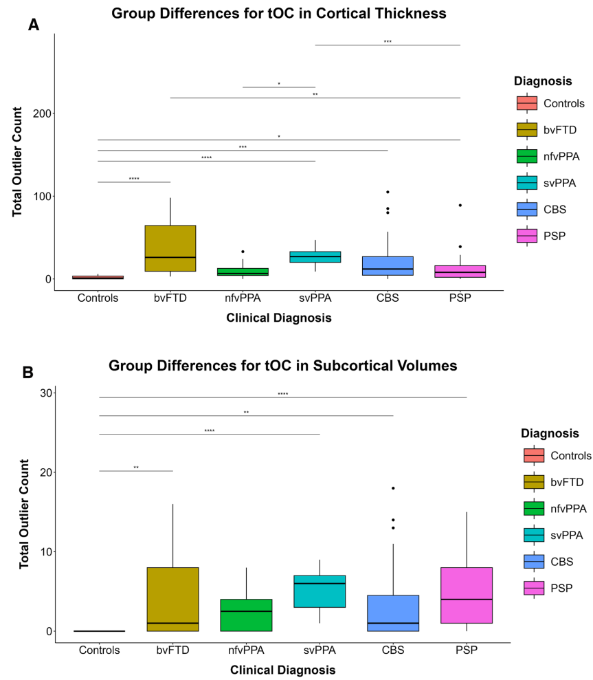 bvFTD、svPPA、CBS和PSP的皮质tOC均显著高于对照组(p<0.05),其中bvFTD的tOC(中位数=26)最高,且显著高于PSP(p=0.002)。svPPA的tOC(中位数=27)显著高于nfvPPA和PSP(p<0.05)。皮下体积tOC方面,所有患者组均高于对照组,其中svPPA(中位数=6)和PSP(中位数=4)异常数量最多。