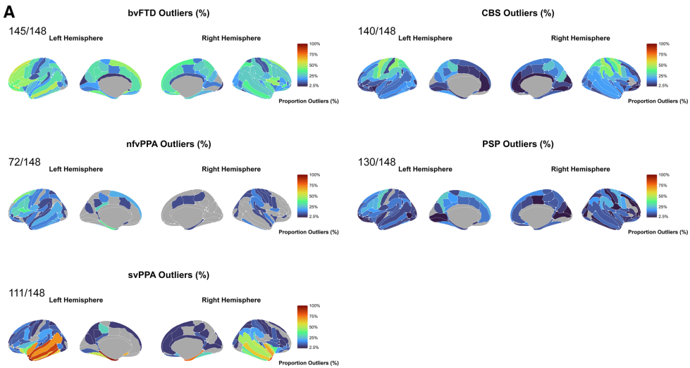 bvFTD患者在145个皮质区域出现异常,异常比例较高的区域包括左半球额下回、额中回和颞中回。svPPA异常主要集中于双侧颞极和颞上回(100%患者左颞极异常)。nfvPPA异常较少,主要位于左额下回。CBS和PSP则共享中央前回、后回等区域的异常,但PSP在丘脑、脑干等皮下结构有更多异常。