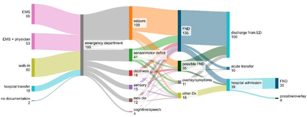 讨论部分强调,本研究揭示了FND在急诊科的实际疾病负担远高于既往认知,这种低估对医疗资源分配和政策制定产生重要影响。美国基于编码数据估计FND相关急诊医疗费用每年超过20亿美元,而真实负担可能数倍于此。研究结果凸显了改进急诊科FND识别、诊断清晰化和结构化护理路径的迫切需求,特别是在功能性癫痫发作等常见亚型的院前和急诊管理方面。提高诊断准确性和编码一致性对于揭示FND的真实影响、调整医疗服务和态度至关重要。
