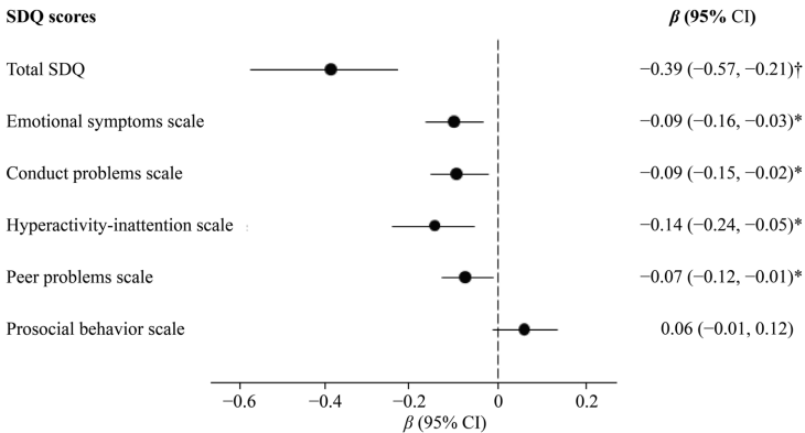 研究发现较高的屏幕时间与较高的总SDQ评分显著相关[β=0.35, 95%CI(0.10,0.61)],特别是在情绪症状[0.10(0.01,0.19)]、品行问题[0.10(0.01,0.18)]和同伴问题[0.08(0.00,0.16)]子量表上。符合屏幕时间推荐(≤2小时/天)的儿童具有较低的总SDQ评分[-0.64(-1.19,-0.10)]和较低的行为情绪困难发生几率[OR=0.67(0.47,0.95)]。