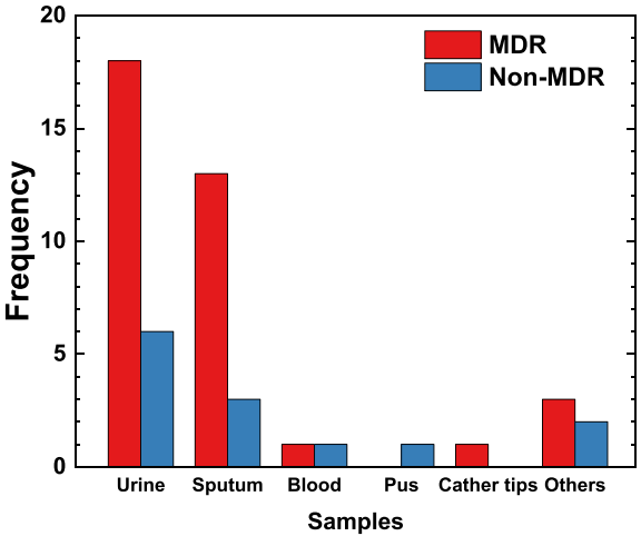 49株肺炎克雷伯菌中,73.5%(36/49)为多重耐药(MDR)菌株。痰标本来源的菌株MDR率最高(81.2%),尿标本次之(75%)。这一发现强调了呼吸道和泌尿道感染治疗中面临的严峻耐药挑战。