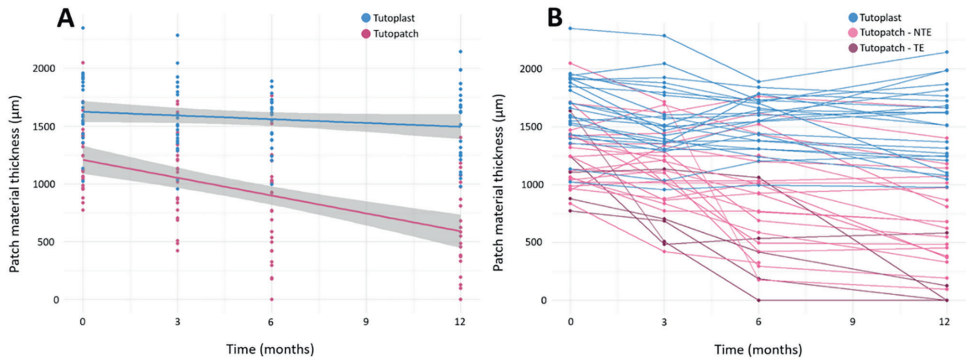 AS-OCT测量显示,术后即刻Tutopatch?组的补片厚度(覆盖管体正上方处)为1020±302μm,而Tutoplast?组为1575±319μm。至术后12个月,Tutopatch?组厚度下降至564±458μm(减少49%),而Tutoplast?组仅降至1380±317μm(减少9%)。线性混合模型分析表明,Tutopatch?组的厚度下降速度显著更快,平均每月多减少42.1μm。